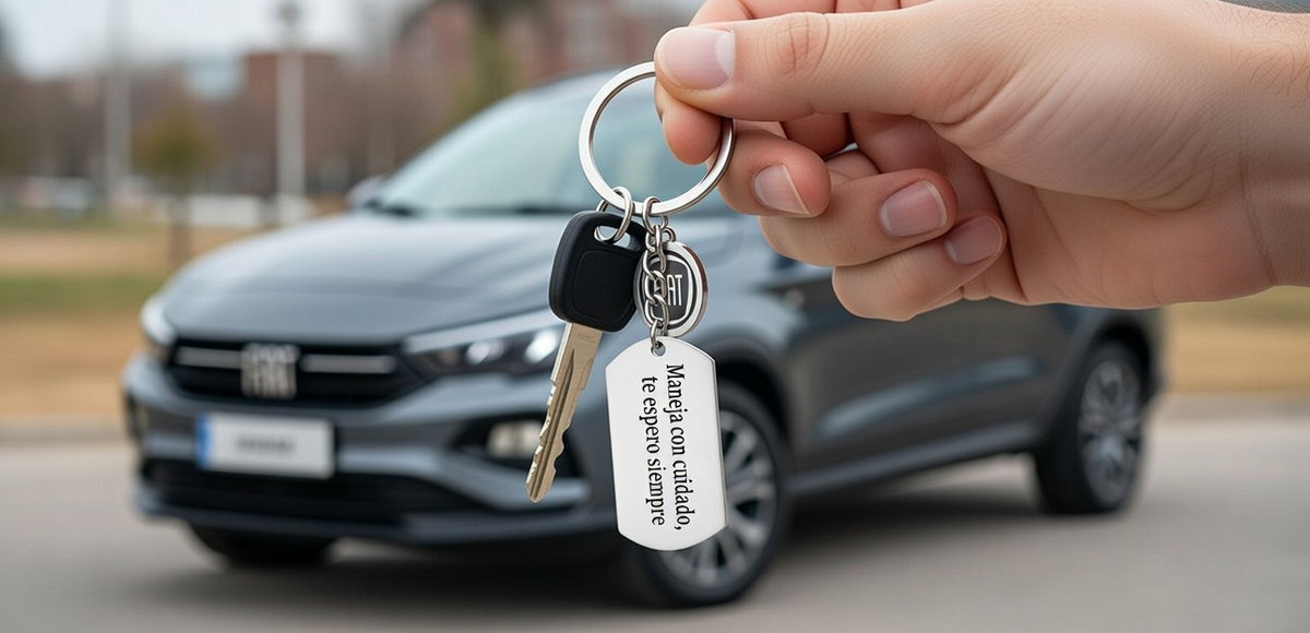 Llavero “Manejá con cuidado" + Dije Marca de autos